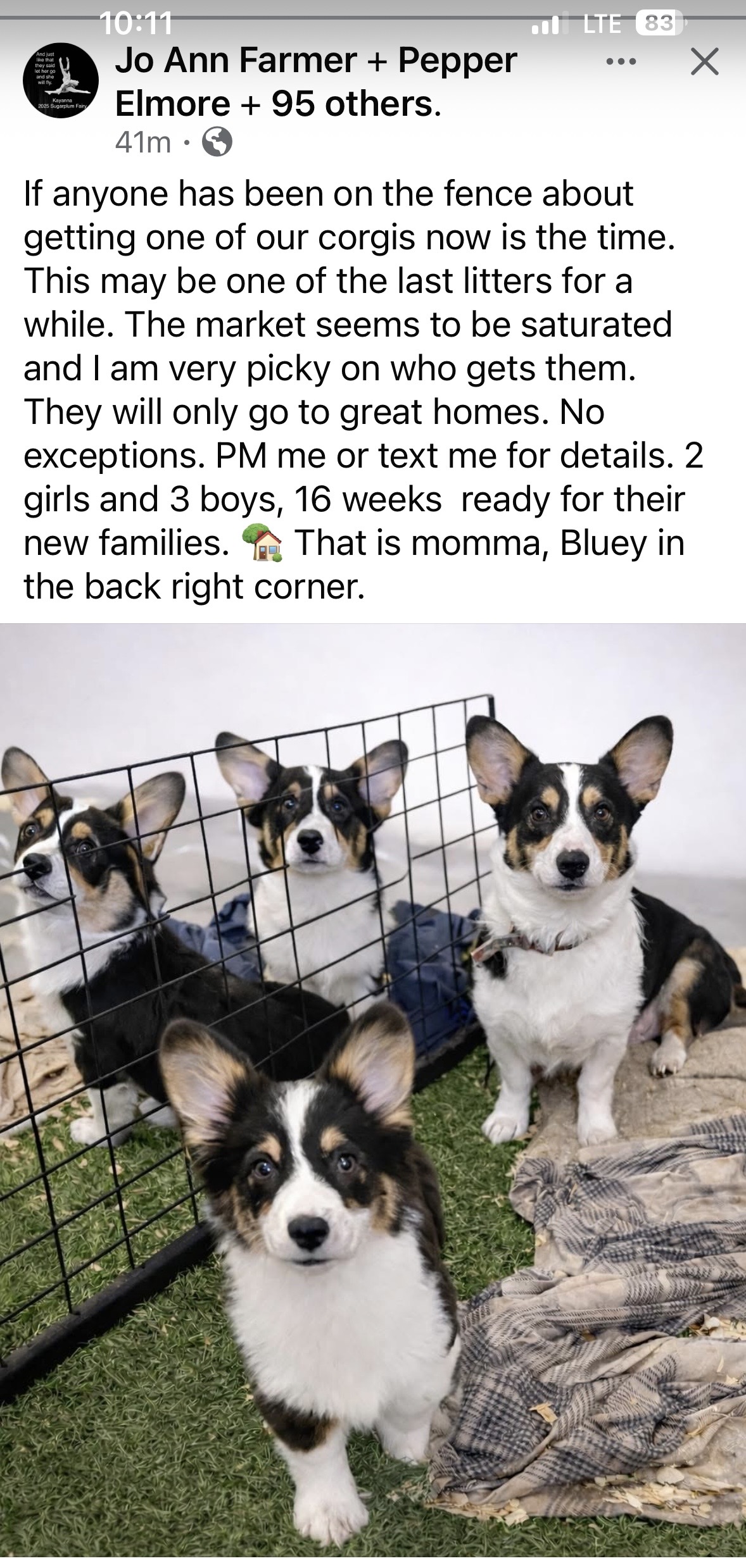 If you’re interested, reach out to Julie to get in touch with Jo Ann. The puppies are based in Texas and are from Jo Ann’s Ranchhand Corgis. Feel free to message me if you have any questions!